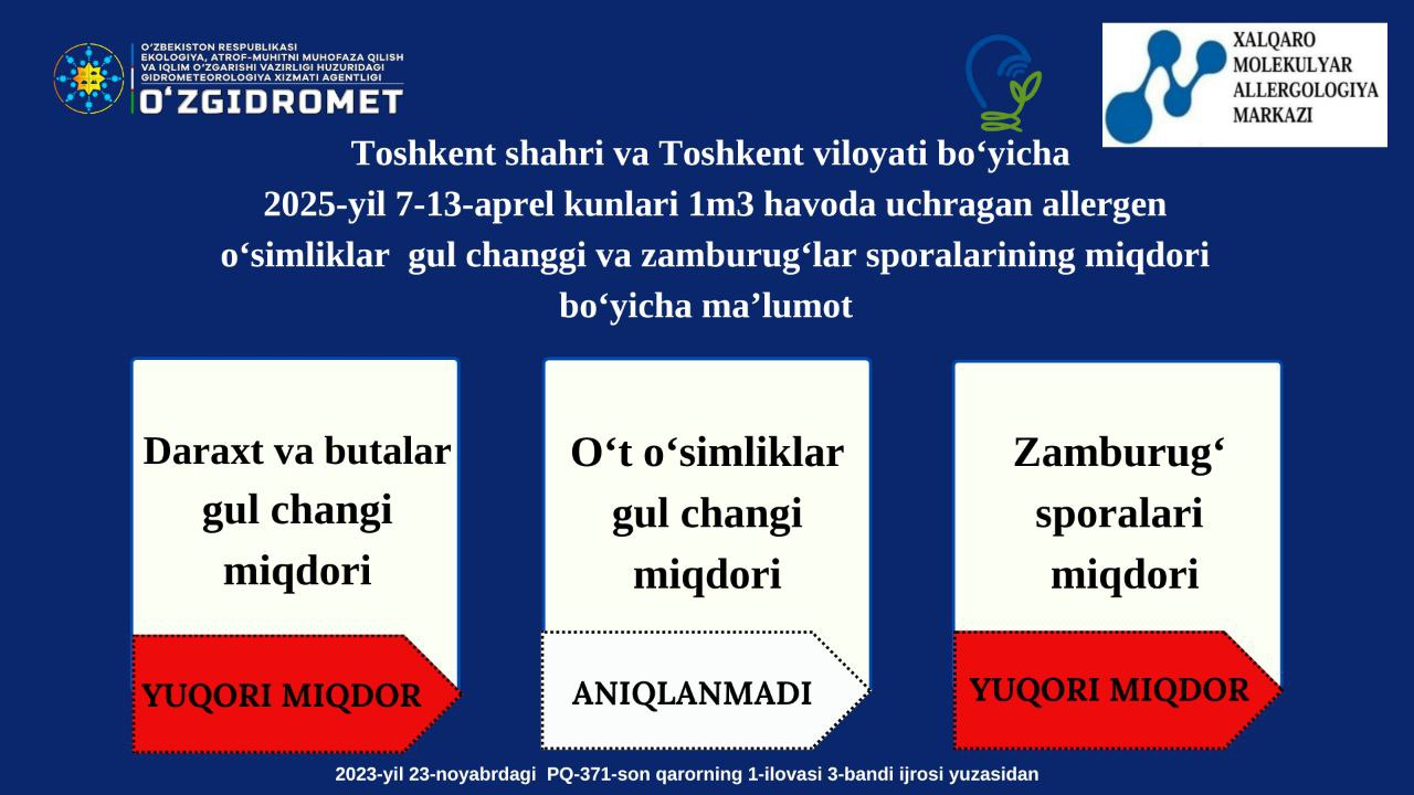 🔹Toshkent shahri va Toshkent viloyati kesimida joylashgan gul chang qopqonidan 7-13-aprel kunlari Innovatsion rivojlanish agentligi huzuridagi Xalqaro molekulyar allergologiya markazi tomonidan olingan ma’lumotlarga ko‘ra, 1m3 havo tarkibida allergen o‘simliklardan daraxtlar va butalarda yuqori miqdorda, o‘tsimon o‘simliklarda o`rta miqdorda, zambrug‘ sporalari yuqori miqdorda uchrashi aniqlandi.